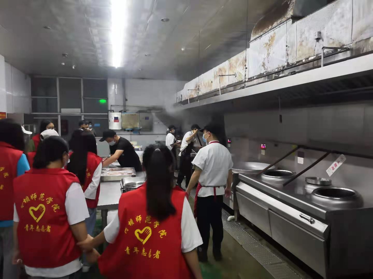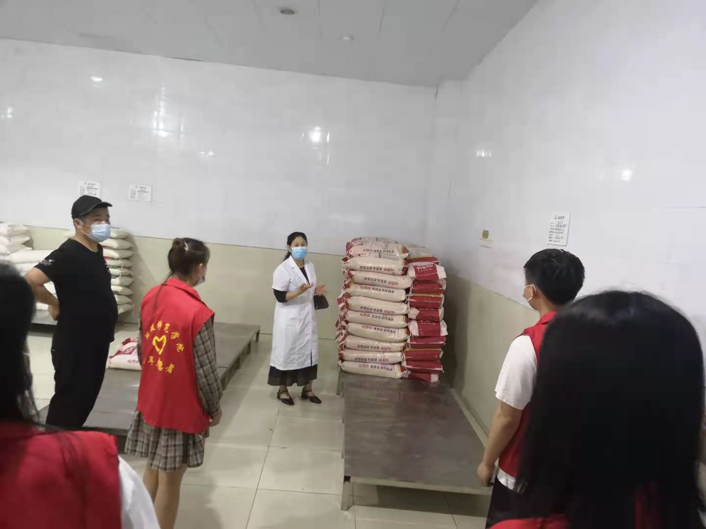 同学们依次参观了食堂的原料储存间、粗加工间、精加工间、烹饪间、蒸煮间、切配间、凉菜间、售卖间和餐具清洗消毒间等场所;详细了解了食堂从食品采购、存储、加工、烹饪到销售、餐饮具洗消、食物留样、各种管理记录、食品监管和生产操作流程以及明厨亮灶工程等各环节的规范操作流程。老师耐心全面地对学生志愿者提出的疑问和建议进行逐一解答和沟通,并希望学生志愿者能将现场看到的学校食堂食品安全监管流程和操作规范等知识传递给更多的同学;最后,食堂经理承诺同学们提出的意见立即进行整改。