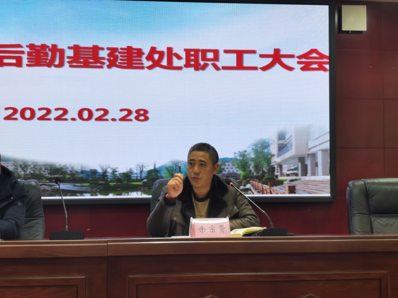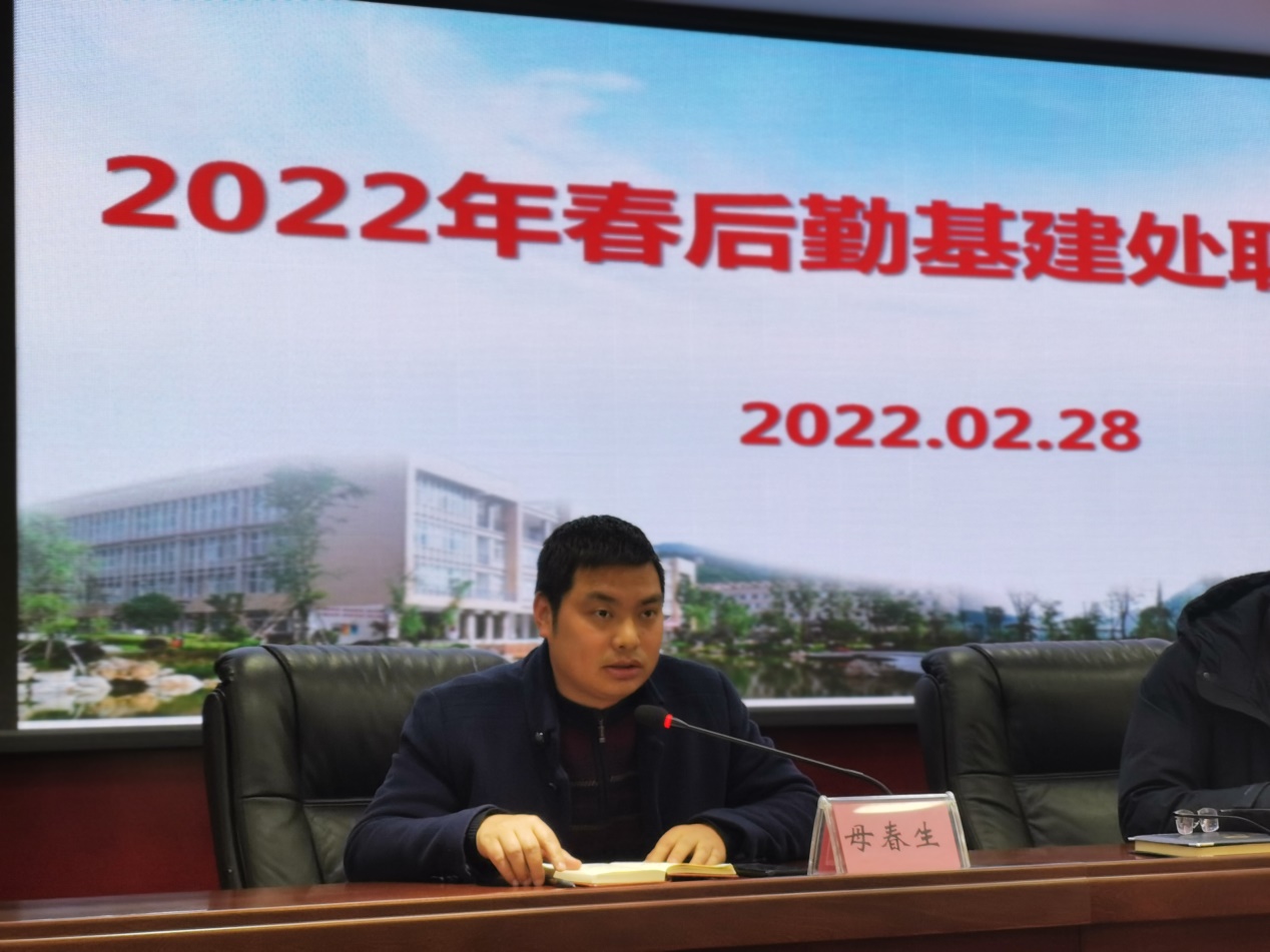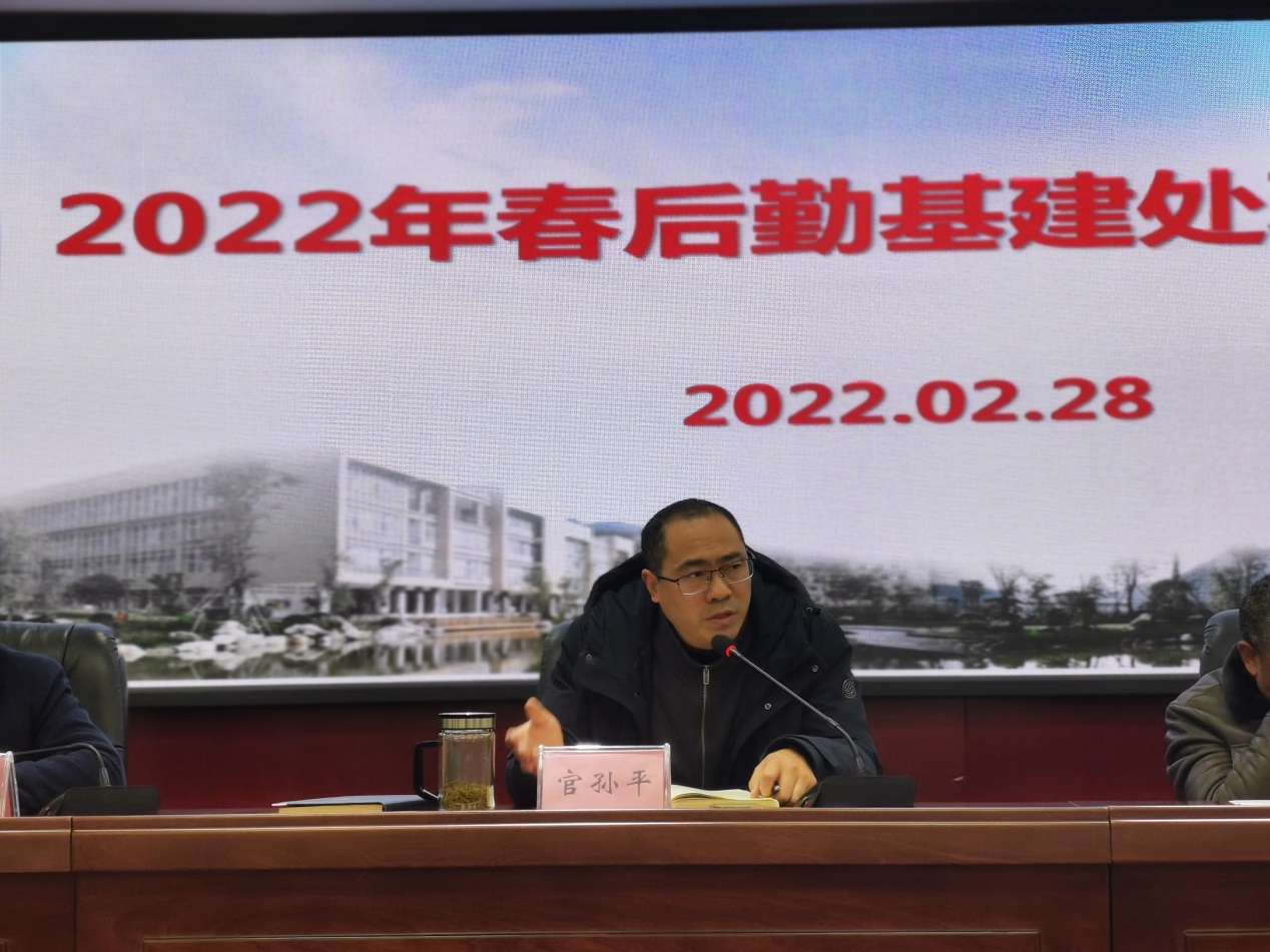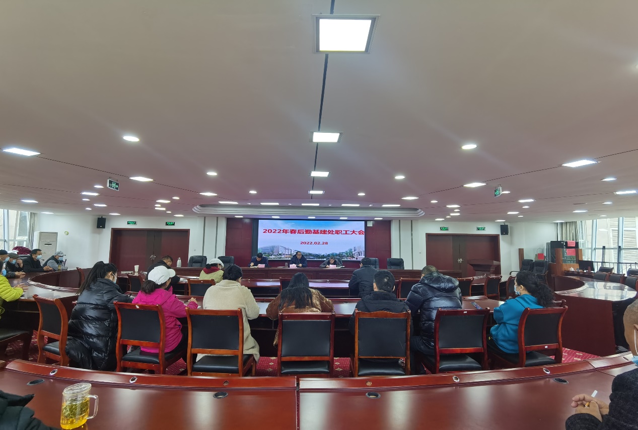 2022年2月28日下午,后勤基建处在行政楼2楼会议室召开2022年春季新学期第一次职工大会。会议由副处长官孙平主持,副处长余宗贤、母春生及全体职工参加会议。
