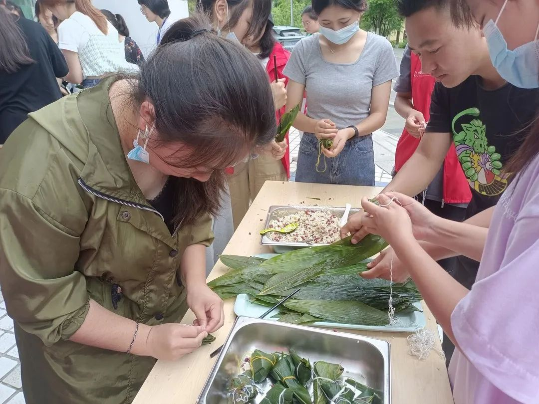 比赛开始,参赛的同学们都在认真包粽子,各院啦啦队队员也在努力加油助威,比赛现场热闹非凡不久就传出了浓浓粽香。