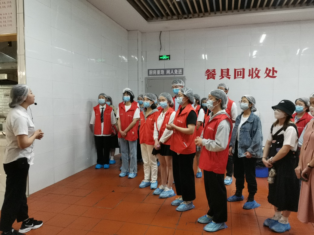 在西苑食堂工作人员的指导下,同学们统一戴好口罩、头套等卫生保护安全措施,随后进入食堂后厨参观学习。
