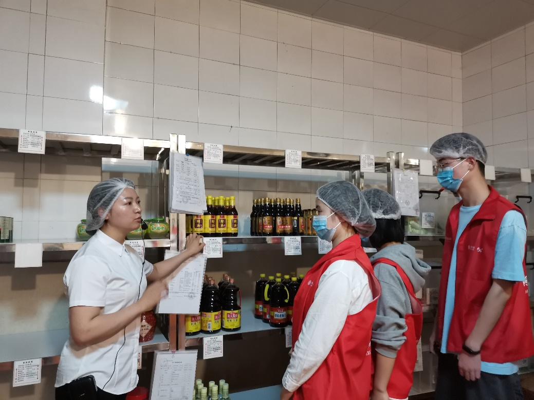 在食堂张凤经理的讲解下,同学们了解到了食品添加剂专用柜、鸡蛋间、更衣间、留样间、烹饪间等食堂后厨操作流程。