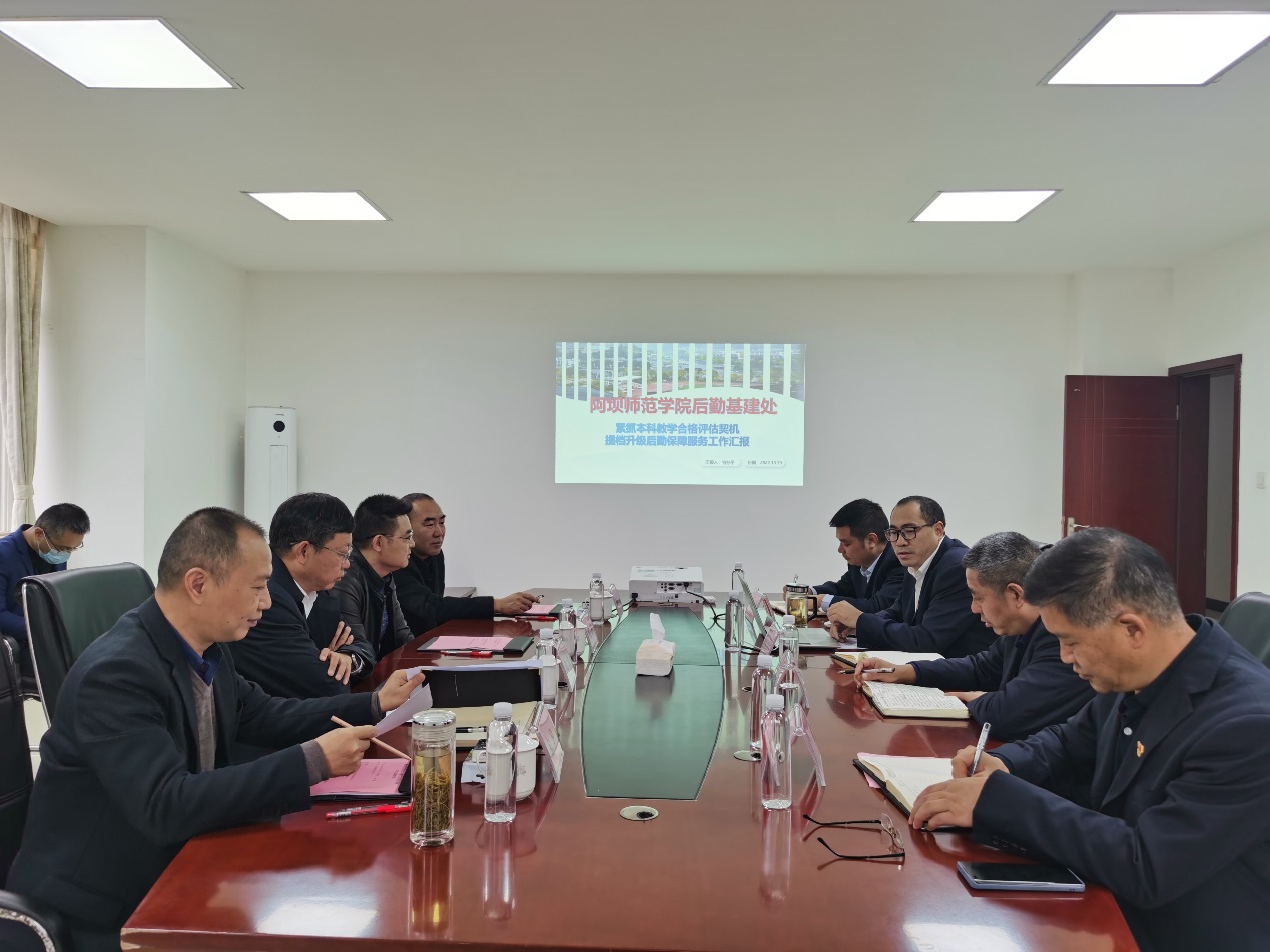 官孙平副处长就“紧抓本科教学合格评估契机,提档升级后勤保障服务工作”做汇报,此次汇报主要包含五个方面。一是后勤基建处基本情况介绍;二是本部门落实学校党委、行政决定有力,有力推进学校基本建设项目;三是始终践行为教学服务、为科研服务、为师生服务,坚持管理育人、服务育人、环境育人的思想,做好后勤日常管理工作;四是本部门积极整改成果与荣誉;五是我校后勤工作的困境与下一步打算。
